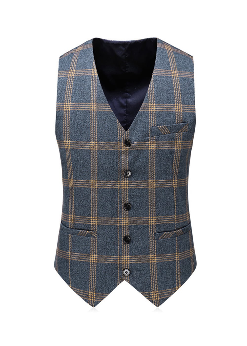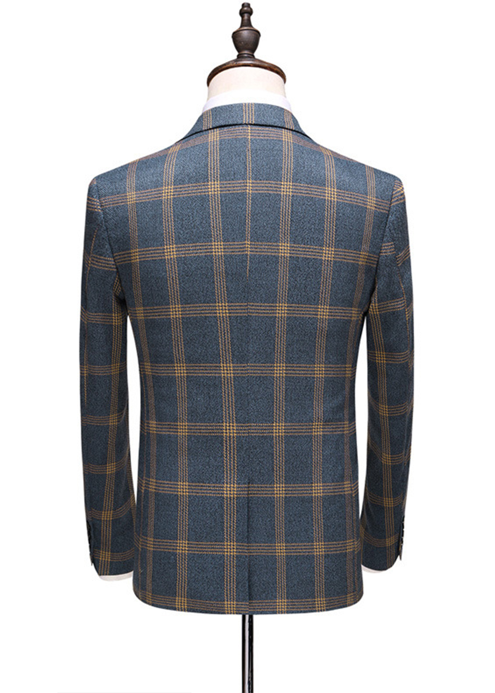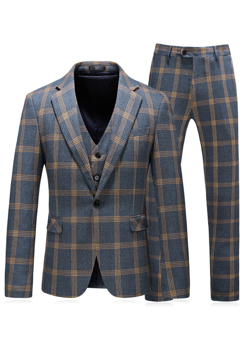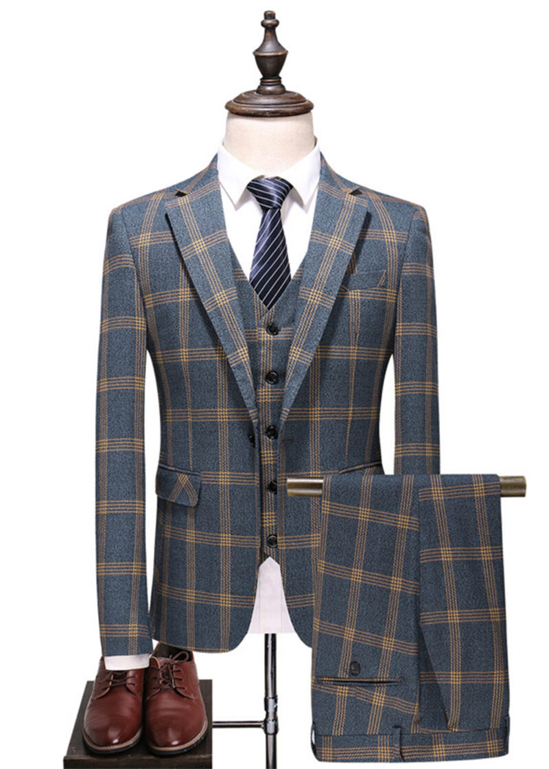 Men’s Classic Business Plaid Suit with Vest & Pant in Blue & Yellow