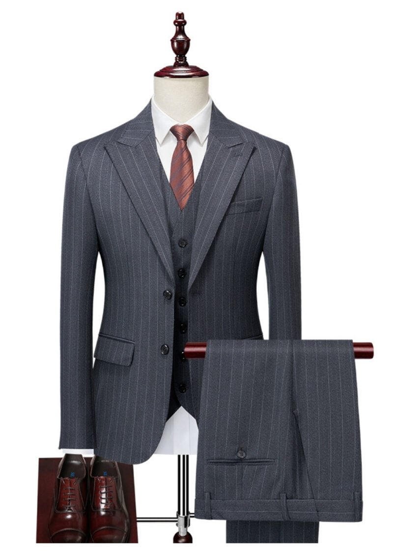 Men’s Dark Grey 3-Piece Peak Lapel Pinstripe Business Suit with Vest & Pant
