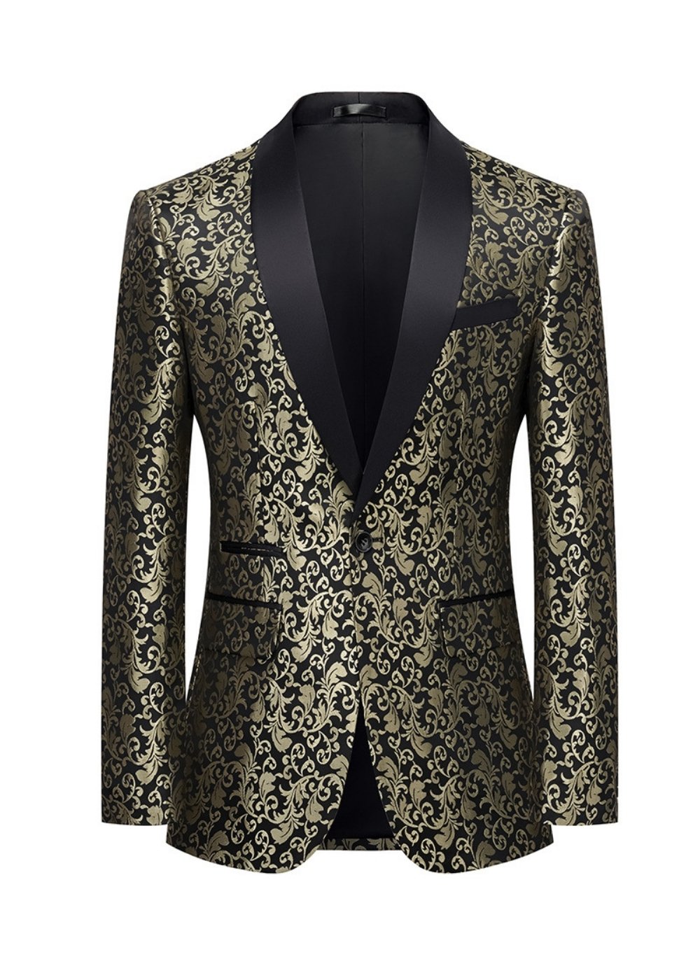 This sophisticated jacquard tuxedo jacket is tailored for elegance and refinement. Featuring a black satin shawl lapel, single-breasted single-button closure, and intricate damask patterns, it is the perfect choice for weddings, formal dinners, and upscale parties.